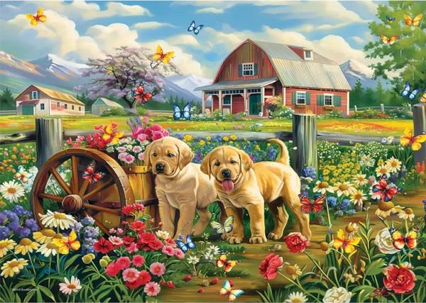 Experience the joy of springtime with the Eurographics Puppy Spring, designed by artist Shawna Stewart. This beautifully illustrated puzzle features playful puppies amidst vibrant flowers and butterflies, evoking the tranquility of a rural spring day. Reconnect with cherished memories of nature’s beauty and enjoy this delightful, engaging activity.