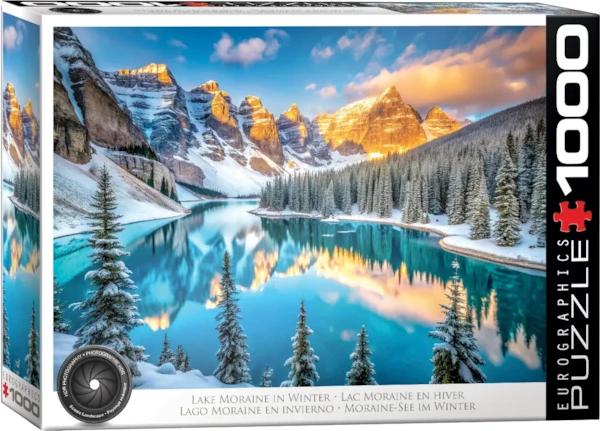 Lose yourself in a breathtaking winter panorama: glowing alpine peaks, snow-dusted evergreens and a glass-calm, turquoise lake mirroring the sunrise. Crisp contrasts—icy blues, golden light, rock faces, forest textures and perfect reflections—create clear sections to share for a smooth, satisfying build.