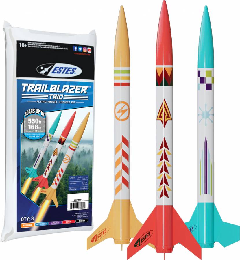 The Estes Trailblazer Trio™ isn’t just a rocket kit, it’s an adventure in the making. With three unique rockets in one pack, you’ll have multiple opportunities to learn, build, and launch with ease. Each design keeps things simple for beginners, but with just enough variation to keep the excitement soaring. Perfect for camps, clubs, or family weekends, these rockets are built to make group projects a success and every launch a shared celebration.