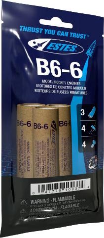 The Estes B6-6 engine is an upper stage engine designed for model rocket flight. This engine can also be used as a single stage engine in lightweight rockets. Each package includes 3 engines, 4 starters and 4 plugs.