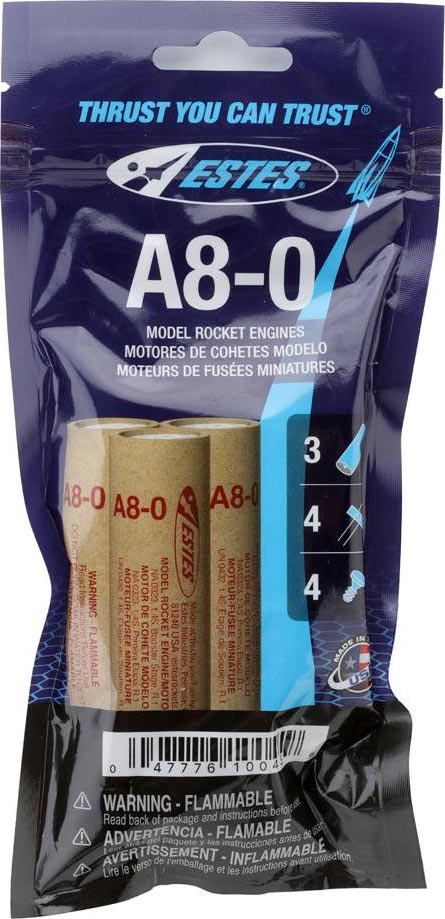 The Estes A8-0 engine is a booster stage engine designed for model rocket flight and has to be used with a standard engine. This engine is for flights in rockets weighing less than 4 ounces, including the engines. Each package includes 3 engines, 4 starters and 4 plugs.