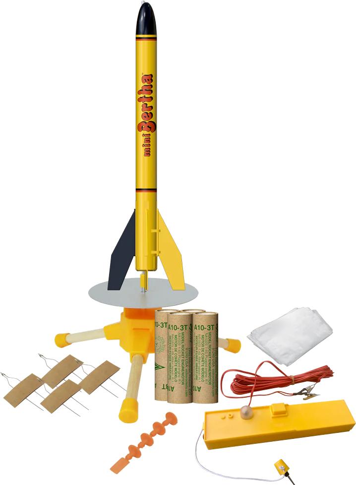 The Mini Bertha™ Starter Set truly has it all. Along with the Mini Bertha rocket, this set includes a Mini Launch Pad and Controller, plus four A10-3T engines complete with plugs, starters, and recovery wadding.