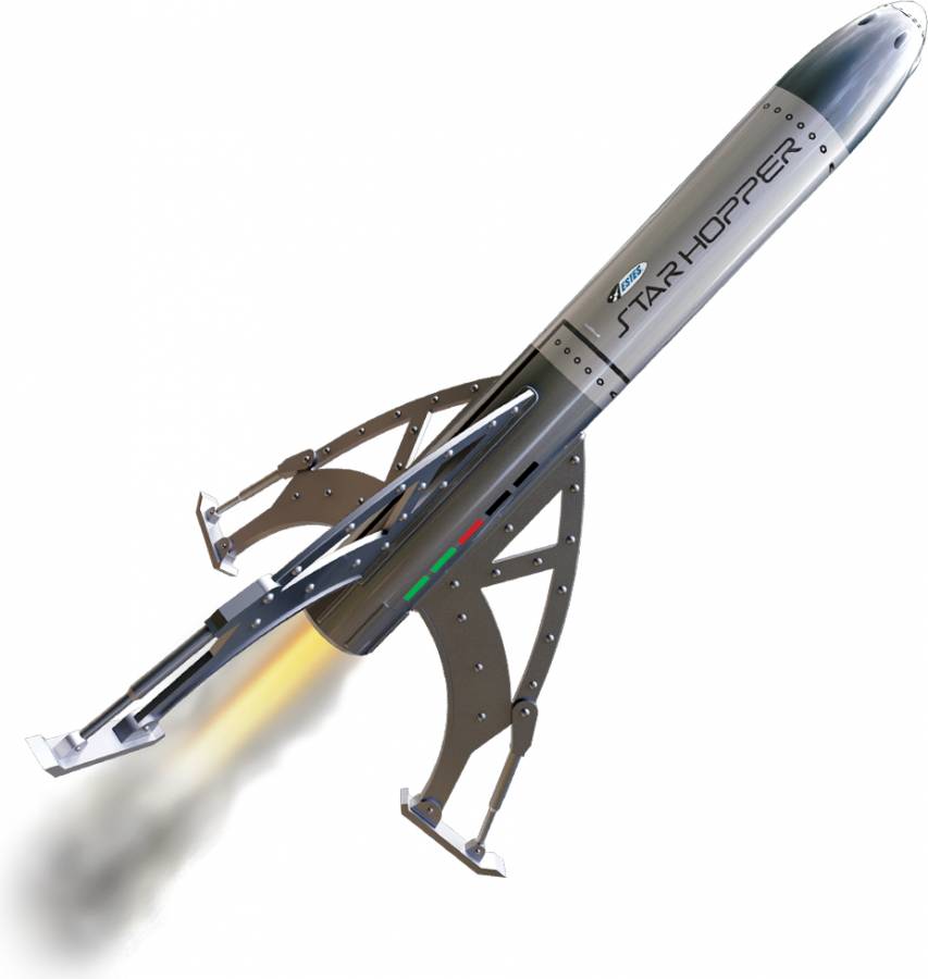 Was there really a Project Star Hopper? It’s hard to say. No documents or proof exists – just rumors and speculation. Based on the scant evidence available, Estes has designed a detailed model of this cryptic craft. The Estes Star Hopper is a Beginner-Level kit that all rocket lovers will be thrilled to own and fly. This is a no-glue, no-paint, snap-together kit that anyone can build and launch all in the same day. Featuring detail-molded plastic fins, nose cone, and engine mount, this kit not only looks great but is built to survive even the roughest landings. Pre-finished in a retro atomic-age silver paint scheme, the Star Hopper is a stylish kit that looks great and flies even better!