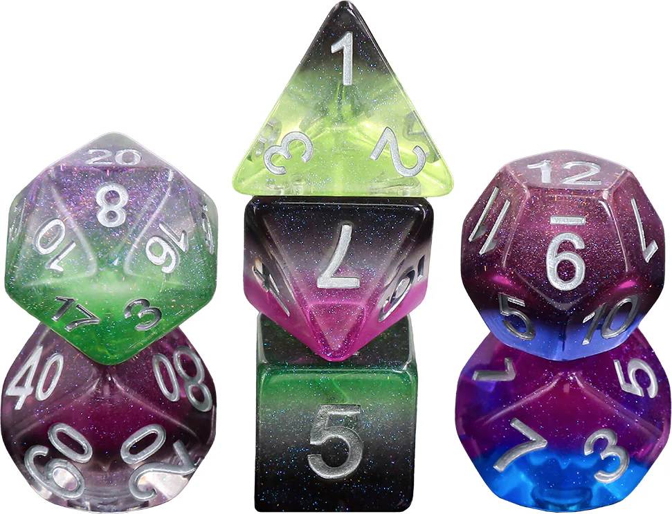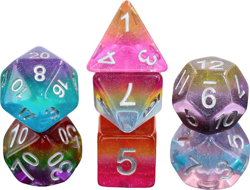 This set comes with two complete dice sets and custom Rainbow Dragon artwork from the legendary comic artist Logan Lubera. Each die in the set is specifically colored to match one of 14 different pride flag colors.