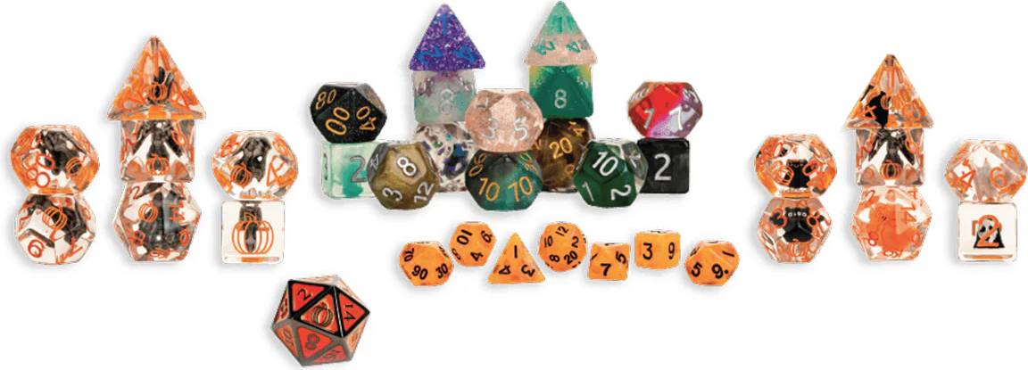 This huge set shaped like a coffin is perfect for display and comes with FOUR full sets of dice! Each calendar includes a mini dice set, two exclusive resin sets, two assorted resin sets, a Halloween-themed dice bag, and a metal d20 for the final day!