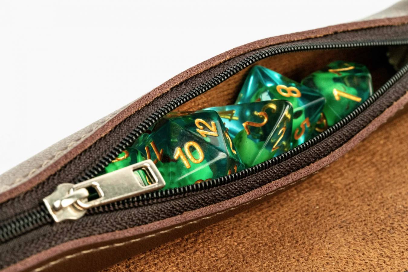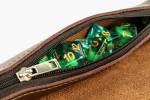 Our scroll rolling map appears to be a rolled up leather scroll, but unwinds into a soft rolling mat for your dice. The secret zipper compartment holds all your favorite dice.