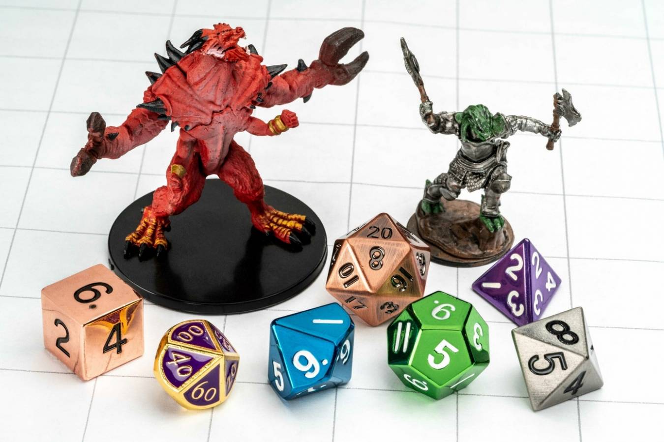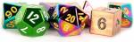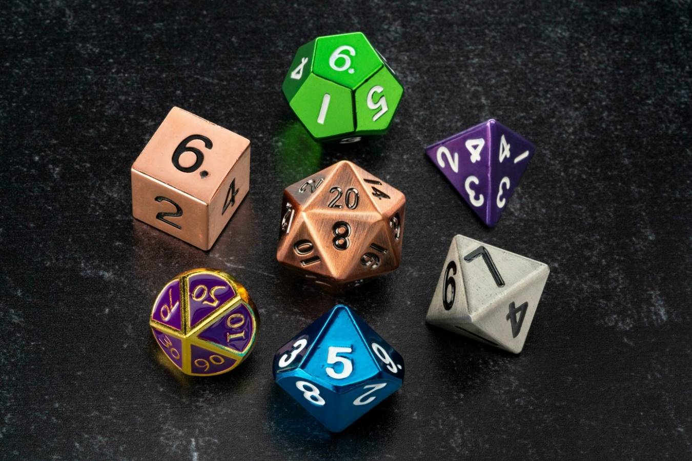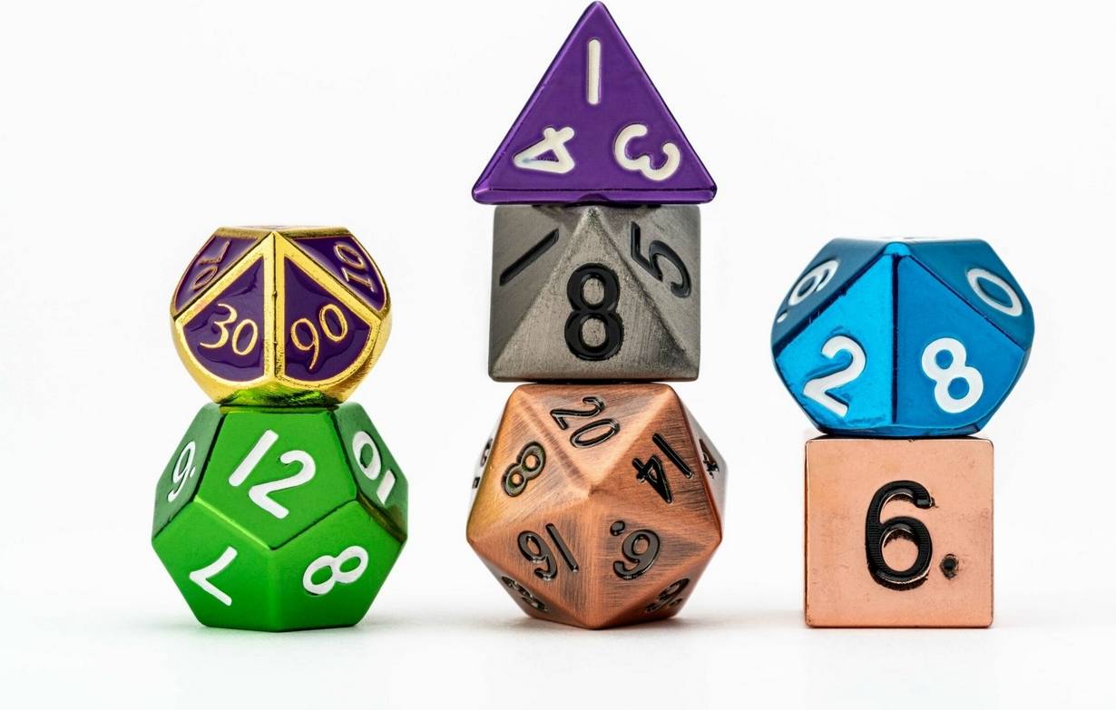 Made with solid zinc and plated with shiny-polished nickel, these 16mm metal dice sets are heavy in your hand, and are built to last. This is a full-sized 16mm polyhedral dice set that comes with 7 dice (d4, d6, d8, d10, d10 (00-90), d12, and d20).