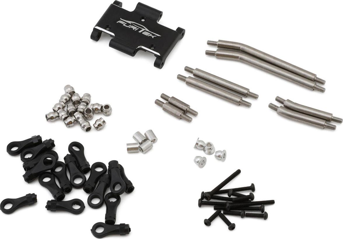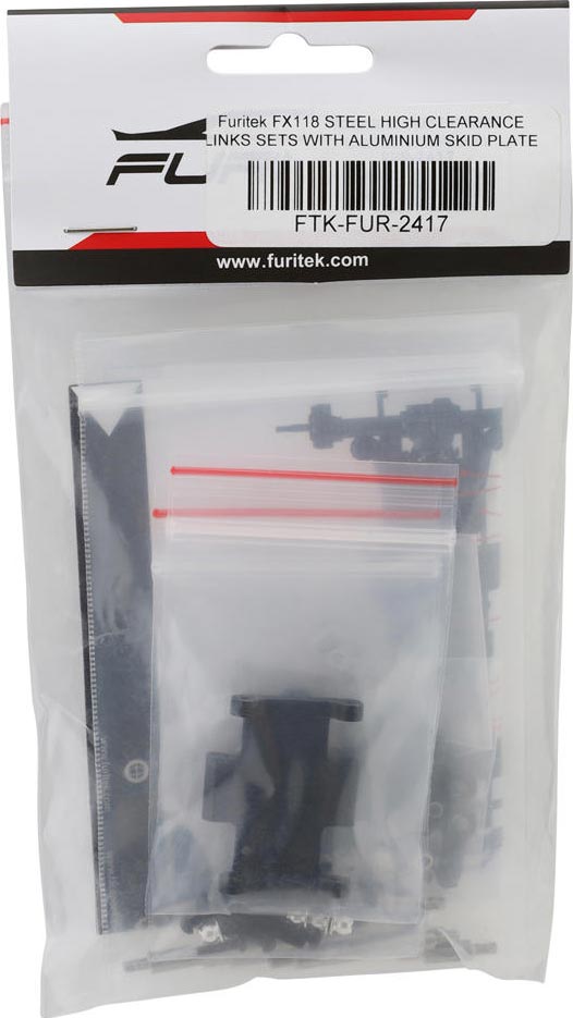 FX118 Steel High Clearance Links Set with Aluminum Skid Plate. Constructed from heavy duty steel with bent lower links, these optional high clearance links are intended for the FX118 micro crawler to tremendously enhance durability compared to the stock composite links and provide added ground clearance for better crawling performance and capability! In addition, this set also includes a super lightweight and rigid anodized aluminum skid plate that removes unwanted flex and boosts the suspension efficiency!