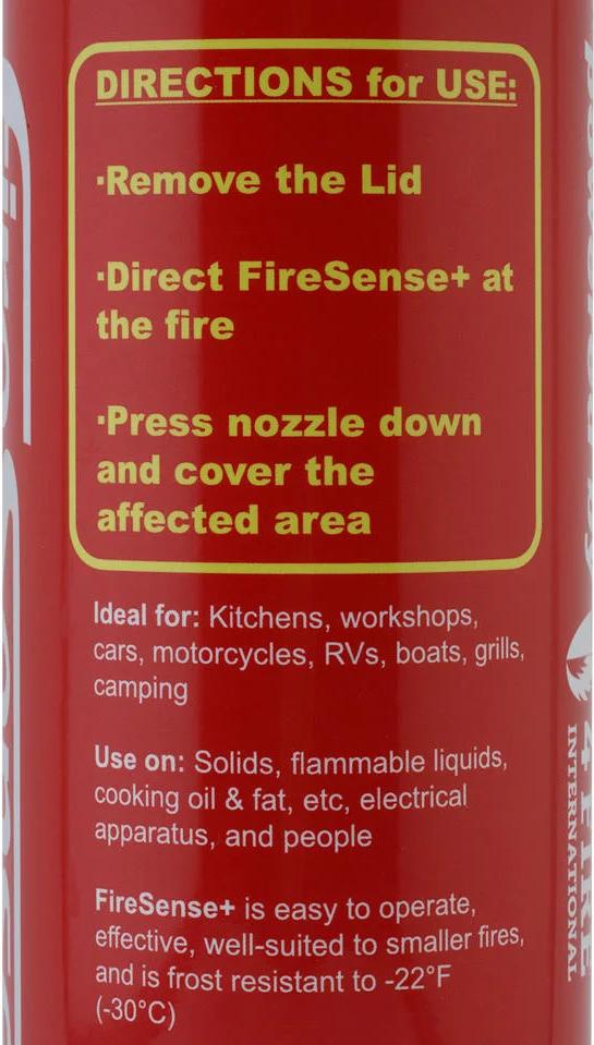 4Fire International FireSense+ Handheld Fire Suppression System. The 13.5oz canister is compact and efficient while remaining value-conscious. This versatile device is intended to handle A, B, F, and Electrical (up to 1000v) rated fires. Its compact design ensures it takes up minimal storage space, making it an ideal solution for constrained storage areas such as pit bags.