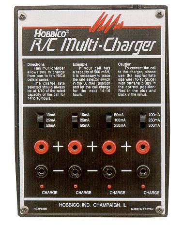 The R/C Multi-Charger will charge four battery packs at once through four independent outlets with adjustable current for a total range of 10 to 500maH. This charger will work with transmitter and receiver packs, glow starters, 12V field box batteries, as well as rechargeable cells used in flashlights, cordless drills, calculators, and more.