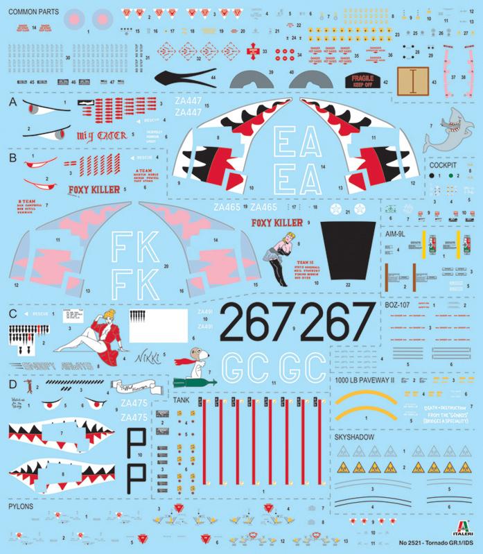 NEW PARTS - More then 350 parts - Fine Photo-etched details - Removable RB199 engine with support trolley - Retracted or extended flaps and slats - Movable ailerons - Openable radome and fully detailed radars - Open or closed thrust reversers - Open or closed air brakes - Rubber tyres - Variable sweep wings and pylons - Rubber cover for wings entry point - Color instruction sheet - Super decals sheet for 4 versions - New Mk.13/18 Peveway LGB - Cockpit Masking sheets