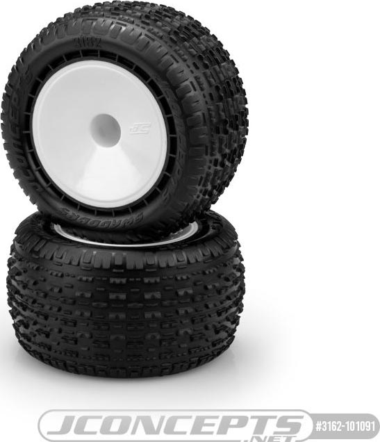 The ultra low-profile carcass keeps a truck very predictable and consistent in high-grip conditions while pointing the vehicle in the correct direction. JConcepts has added side-wall ribs in a circular pattern to the exterior of the tire to support high-grip racing. The pink compound marked with 2 pink dots on the tire represents a new compound for JConcepts, a medium soft material with good wear characteristics. The Swagger front tire includes open cell inserts for the best performance in a variety of conditions.