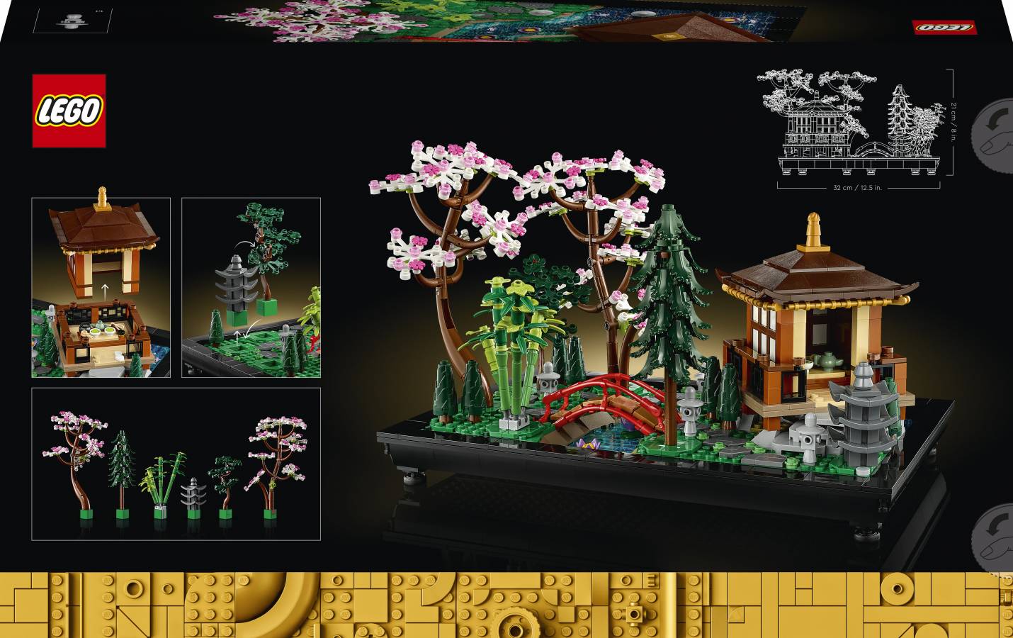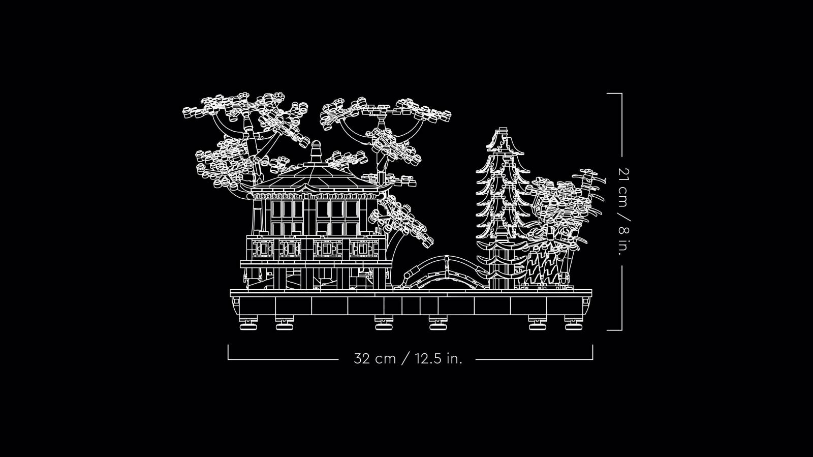 Based on a traditional Japanese garden, this buildable model includes an arched bridge, stream, koi carp, lotus flowers, trees, rocks, stone lanterns and a pavilion with a detailed tea-ceremony room.