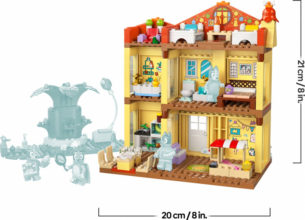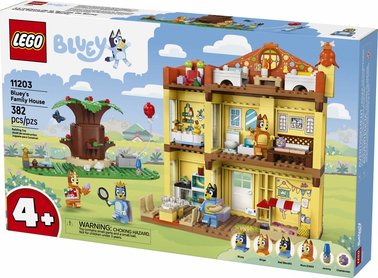 The multi-room, modular playhouse comes with 4 minifigures – Bluey, Bingo, Chilli (Bluey’s mum) and Bandit (Bluey’s dad) – plus accessories, including a rainbow cape, wand and magnifying glasses. All rooms are detachable, allowing many ways to play. Inside the playroom is a dollhouse, piano and pretend-play food stall. The kitchen has a fridge, oven, stove, table and chairs. Upstairs is Mum and Dad’s bedroom and a bathroom. Bluey and Bingo’s attic bedroom has a rug, lamp and the Chattermax figure. Next door is the Queen’s throne, complete with teapot, cup and frog. In the garden is a large tree, a hot dog, pizza, water tap, Jeremy the gnome and a balloon to knock up into the air.