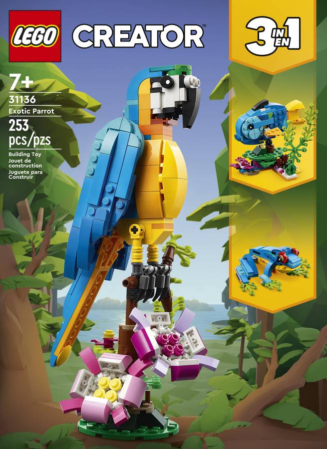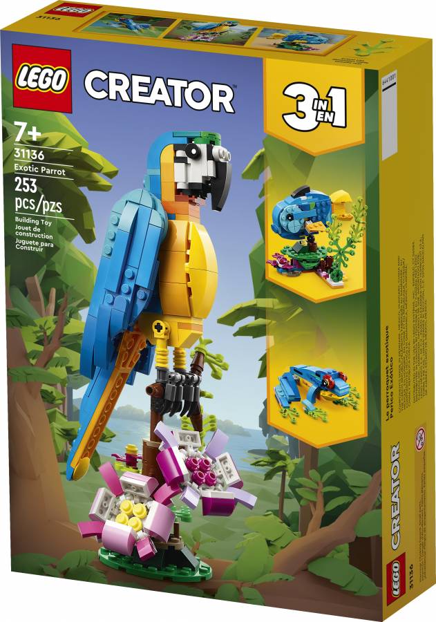 Little builders and passionate animal fans aged 7+ can travel deep into the rainforest for action-packed stories with this LEGO® Creator 3in1 Exotic Parrot (31136) building set. It features a colorful parrot that can fully rotate its body while sitting on a tree branch and move its wings and tail.
