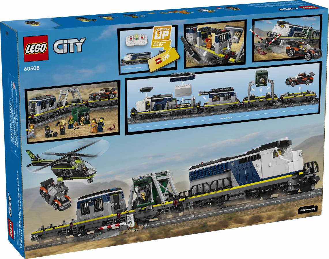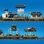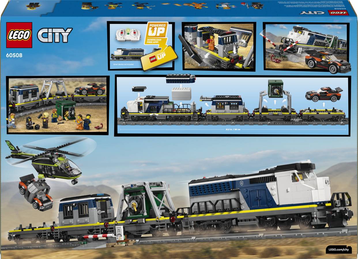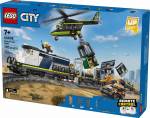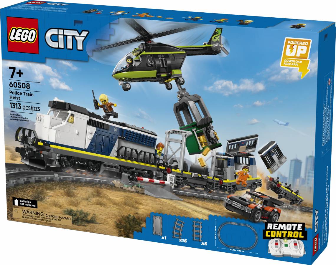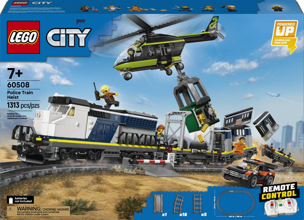 All aboard for action-packed adventures with the LEGO® City Police Train Heist! The city police are transporting a captured crook, his getaway rally car and a stolen bank safe on the police train. But the crooks have other ideas and have modified a helicopter with a huge grabbing claw to perform the most daring heist in history. Will they succeed or will the LEGO City police save the day?