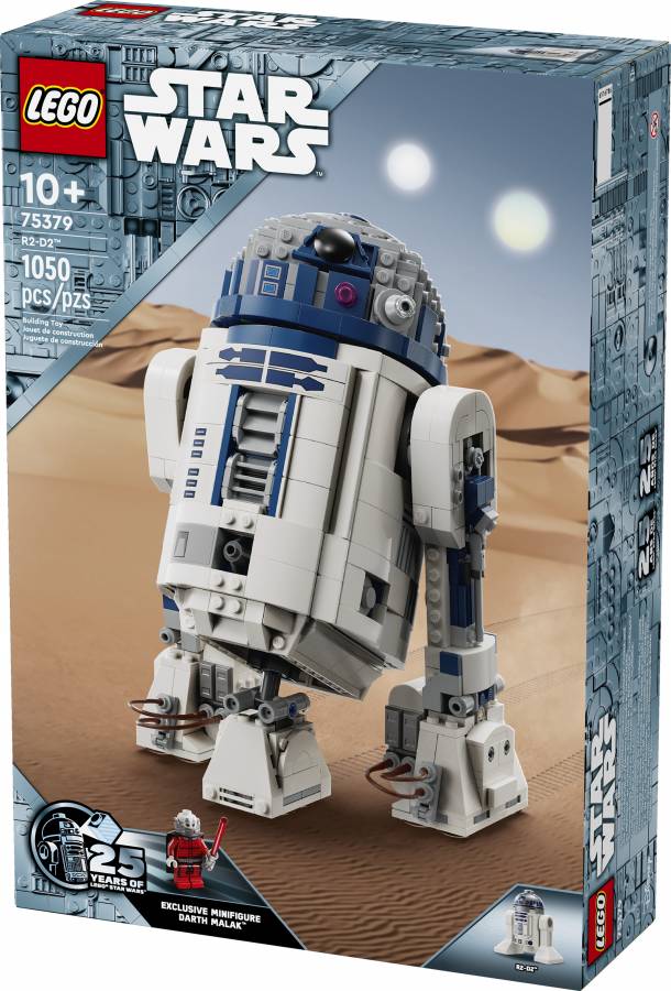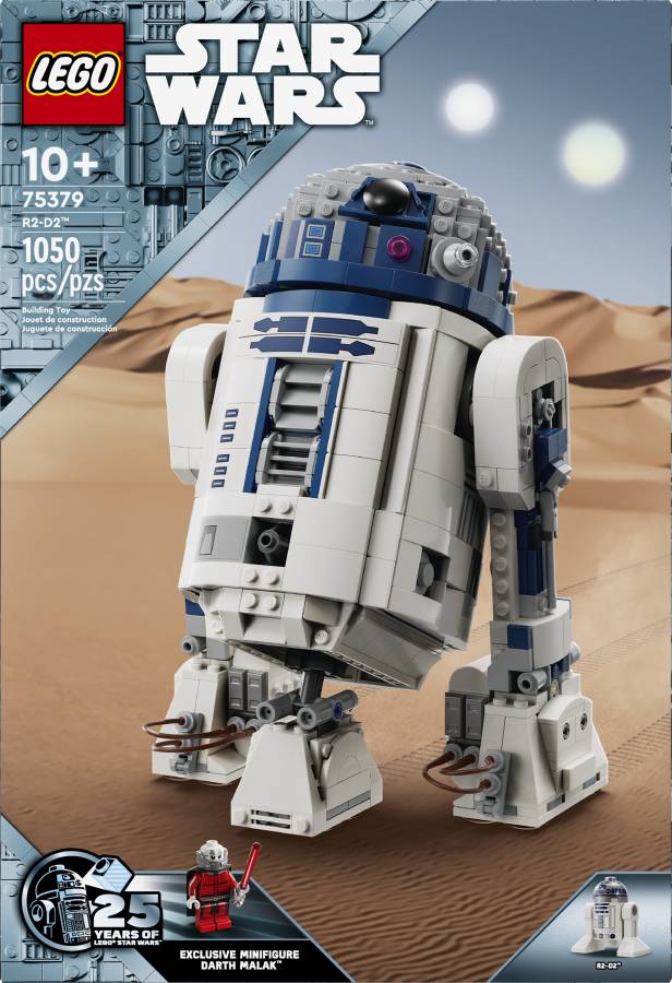 To create an eye-catching display, this collectible toy building set also features an R2-D2 LEGO droid figure, a special LEGO Star Wars 25th anniversary minifigure of Darth Malak with a lightsaber and display stand, plus an R2-D2 information plaque.