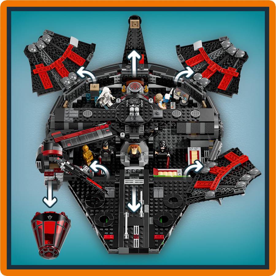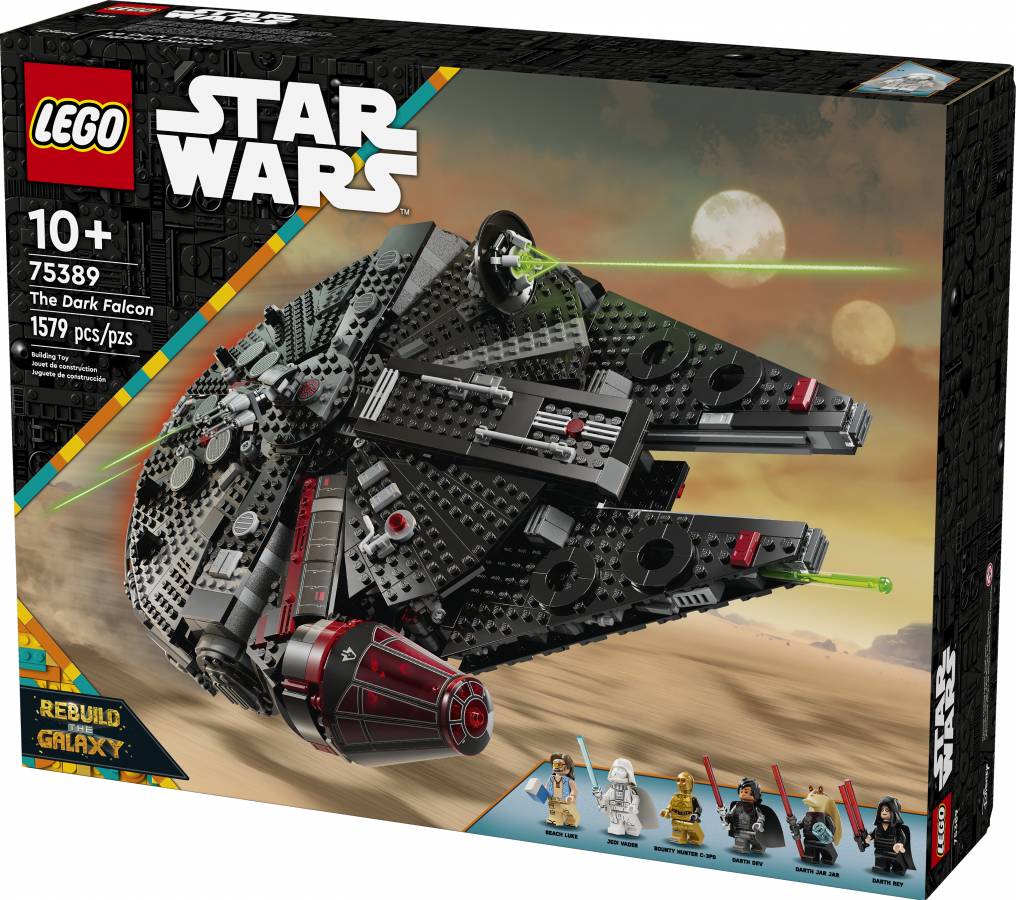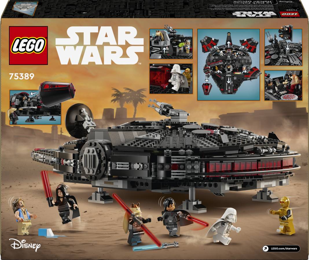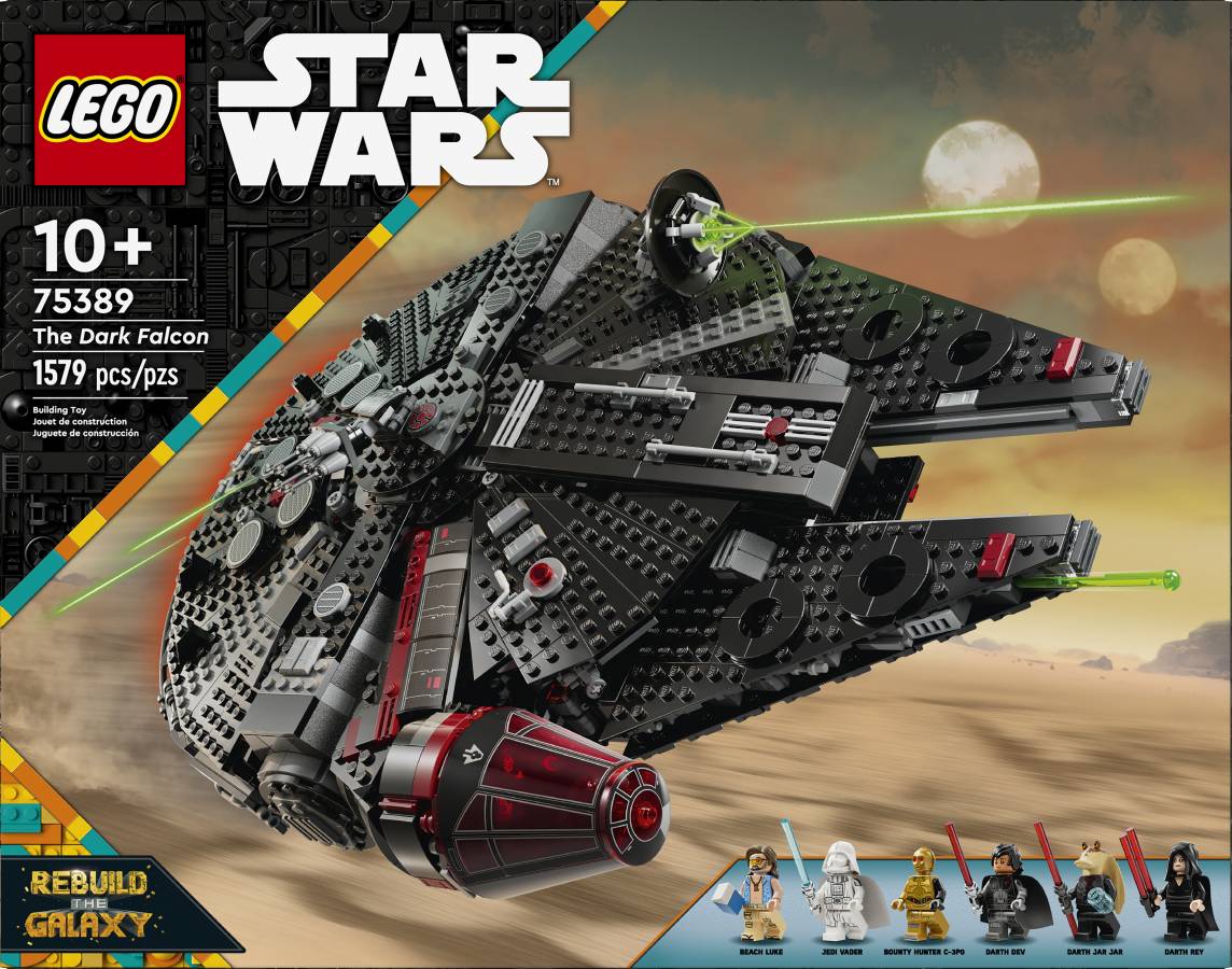Turn the LEGO® Star Wars™ universe upside down with The Dark Falcon buildable toy vehicle set for kids (75389), which features a dark version of the Millennium Falcon, as seen in the LEGO Star Wars: Rebuild the Galaxy Disney+ special. A thrilling birthday gift for boys, girls and any fans aged 10 and up, this LEGO Star Wars brick-built starship toy has flip-up panels for easy access to the detailed interior, including Darth Jar Jar’s throne, the command center, hyperdrive, entertainment area and jail cell. Spring-loaded shooters, rotating cannons and a removable gunner post add to the action-play possibilities.