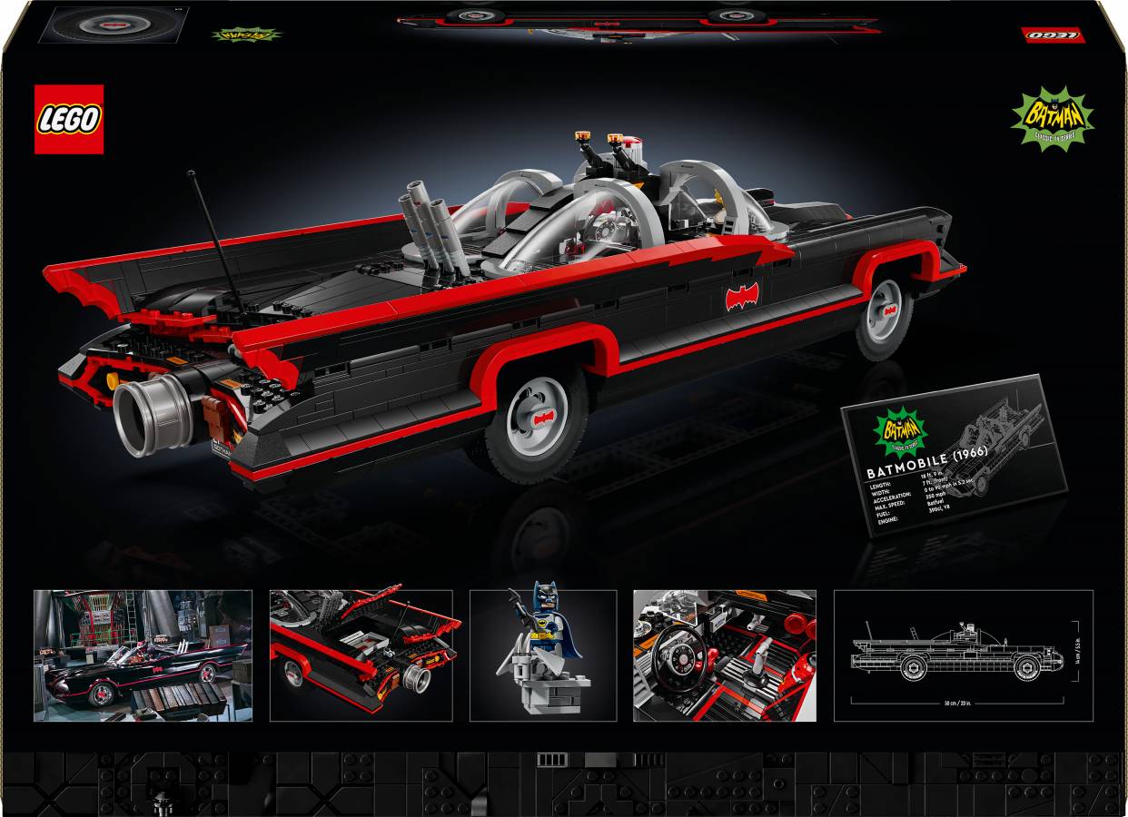 This eye-catching piece of DC Super Heroes™ memorabilia is inspired by the iconic Batmobile from the 1966 TV show. The vehicle features a molded windshield, rotatable wheels, authentic decorations and an opening trunk containing the Bat-Computer. A 1966-style Batman minifigure wearing his distinctive cape and cowl and holding his Batarang™ stands on a platform (the minifigure does not fit inside the car). For added convenience, a digital version of the set’s building instructions can be found on the LEGO Builder app.