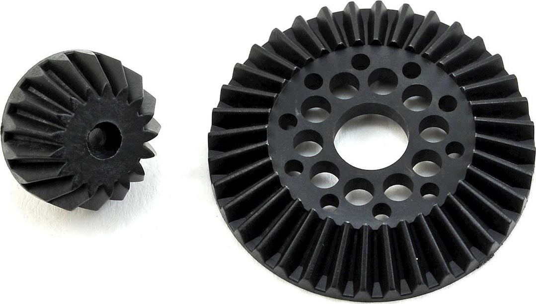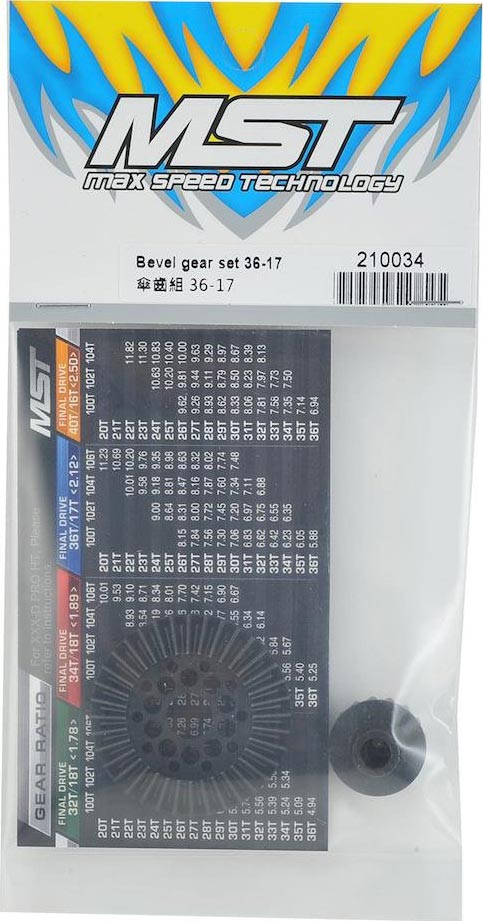 MST Bevel Gear Set. This is the 36 tooth rear main gear and 17 tooth bevel gear used on the FXX-D chassis, but can be used as a gear tuning option on the RRX, RMX, FSX and XXX models as well.