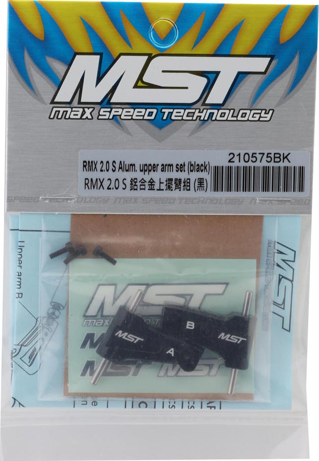 MST RMX 2.0 Aluminum Upper Arm Set. This is the optional aluminum upper arm kit for the MST RMX 2.0 kit and is a direct installation upgrade for the stock plastic upper arms (MXS230062). These aluminum arms will help to stiffen up the suspension assembly for increased durability and more precise handling performance. Package includes right and left side upper arms, hinge pins and hardware.