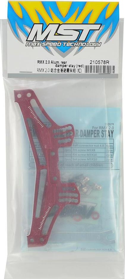 MST RMX 2.0 Aluminum Rear Damper Stay. This is the optional aluminum shock tower for the MST RMX 2.0 kit and is a direct replacement upgrade for the tower included in the kit (MXS230064). This aluminum upgrade will give your ride a high end custom look, and offers an incredible amount of shock mount options, compared to the five allowed by the stock plastic tower. The aluminum tower also allows sixteen different link mount options compared to the five allowed by the stock tower for increased roll center tuning options. Plus, the aluminum material will help to stiffen up the suspension assembly for increased durability and more precise handling performance. Package includes one aluminum shock tower and mounting hardware.