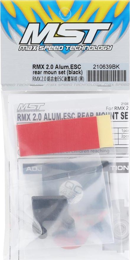 The MST RMX 2.0 Rear ESC Mount is an optional part intended for the RMX 2.0 platform. This mount locates the ESC over the rear axle moving the weight bias rearward while adding style. The main mounting bracket is constructed from CNC machined aluminum and features an adjustable carbon fiber ESC mounting plate. The adjustable carbon fiber plate allows the ESC to be mounted in high, middle and low positions.