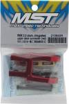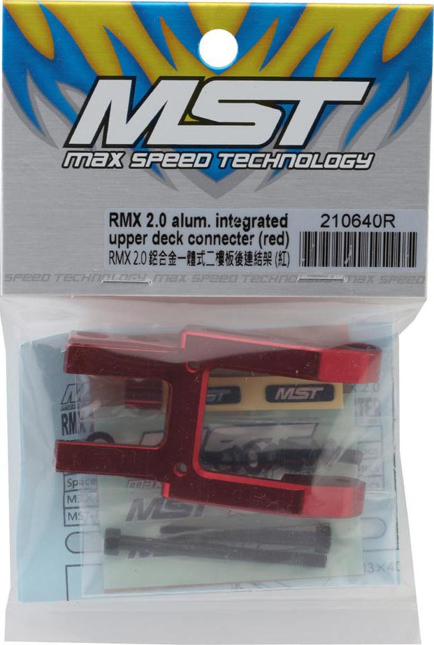 MST RMX 2.0 and RMX 2.5 Aluminum Integrated Upper Deck Connector. Constructed from super lightweight and rigid aluminum, this optional upper deck connecter is intended for the MST RMX 2.0 and RMX 2.5 platforms to reduce flex which boosts handling and predictability while enhancing durability and adding bling to your chassis.