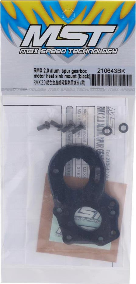 MST RMX 2.0 Aluminum Motor Mount. This is the optional motor mount and will help aid efficiency through the motor mount assembly allowing for increased strength and heat dissipation, as well as more precise pinion and spur gear mesh. This mount is a direct replacement upgrade for the stock mount (MXS310101R). Package includes motor mount and hardware.