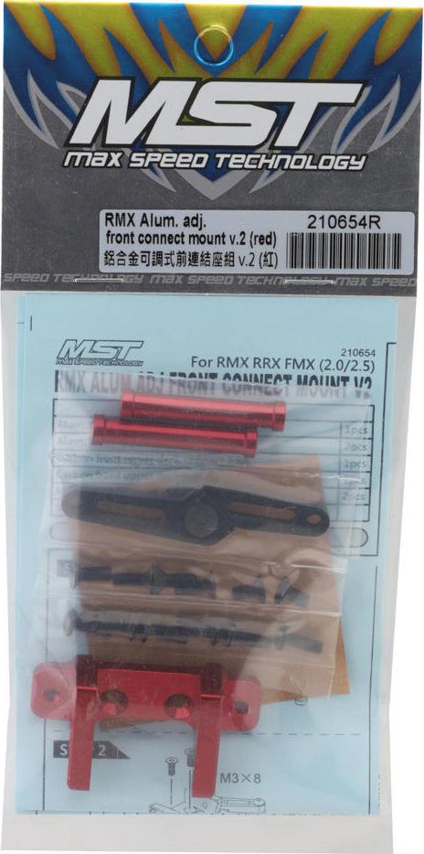 MST RMX Aluminum Adjustable Front Connect Mount V.2. Constructed from Super lightweight and rigid aluminum and carbon fiber, this optional adjustable connect mount set is intended for the MST RMX platforms to noticeably reduce flex to maximize steering precision and response feel while tremendously enhancing durability.