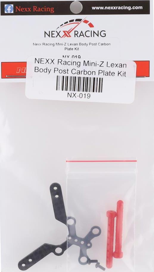 An optional upgraded NEXX Racing Lexan Body Post Carbon Plate Kit, suited for use with the Mini-Z family of vehicles when using a lexan body. Includes different mounting locations to be highly adaptable to most chassis and body configurations. Includes two body posts, and mounting hardware.