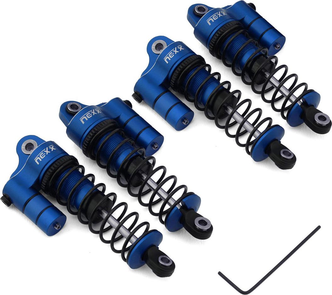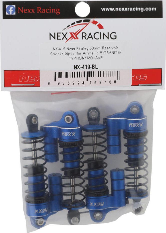 NEXX Racing Arrma Grom 58mm Aluminum Oil-Filled Threaded Reservoir Shocks. Constructed from high precision CNC-machined aluminum and features a fully functioning reservoir with a realistic divider piston with a set screw for adjusting the shock rebound, an inner O-ring design to prevent leaks and a completely serviceable design that is perfect for fine-tuning your spring rate as well as dampening effect, these optional aluminum threaded oil-filled shocks are intended for the Arrma Grom platforms Provide smoother dampening action, extra tunability to your Grom and longer travel than the stock shocks! Elevate your Grom performance with these NEXX Racing aluminum shocks.