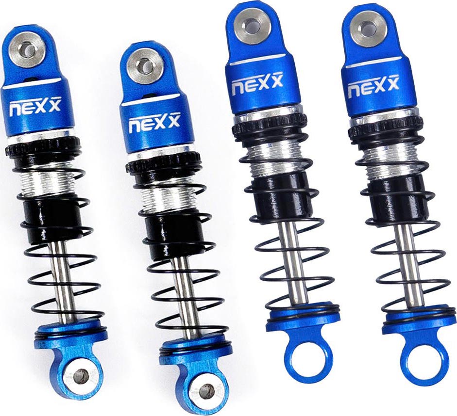 The NEXX Racing Losi™ Micro-B Pre-Assembled Aluminum Oil-Filled Shocks are a high-performance upgrade intended for use on the Losi Micro-B 1/24 2WD Buggy, enhancing both front and rear suspension for smoother handling and improved control. These shocks feature durable aluminum bodies that are lightweight yet resilient, helping to maintain consistent performance over various terrains. Featuring threaded shock bodies, they allow for quick and easy pre-load adjustments to fine-tune the suspension setup. The inclusion of nylon bottom rod ends supports flexibility while maintaining durability, and the shocks are engineered to achieve maximum travel distance, giving the buggy exceptional movement and adaptability on the track. Additionally, these shocks are pre-filled with high-quality oil that helps to keep performance consistent over time, making these shocks ready for installation right out of the package!