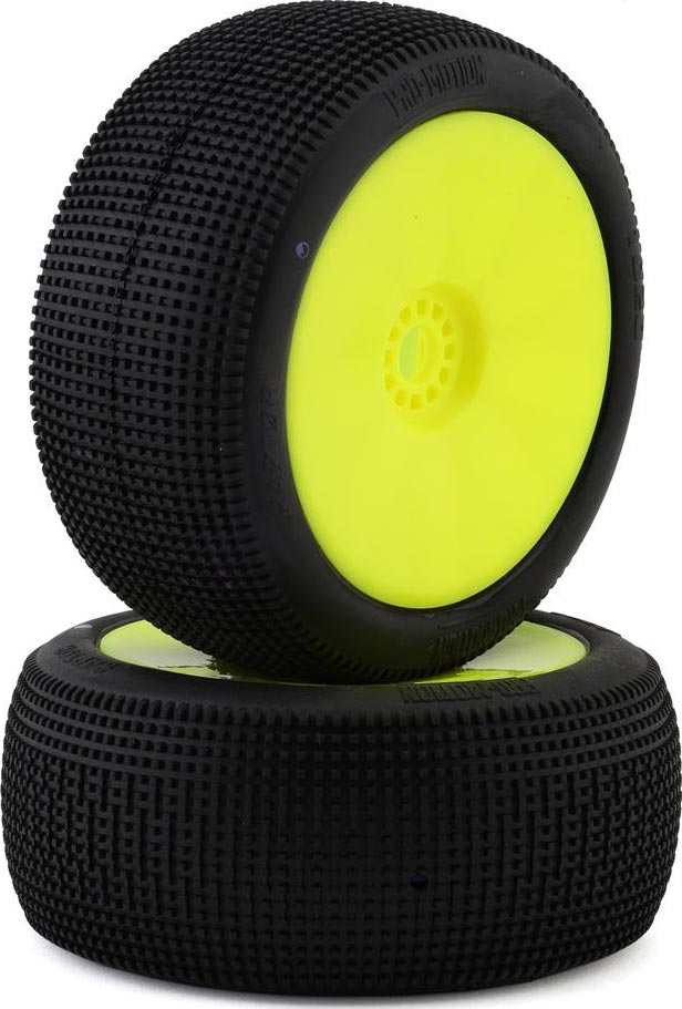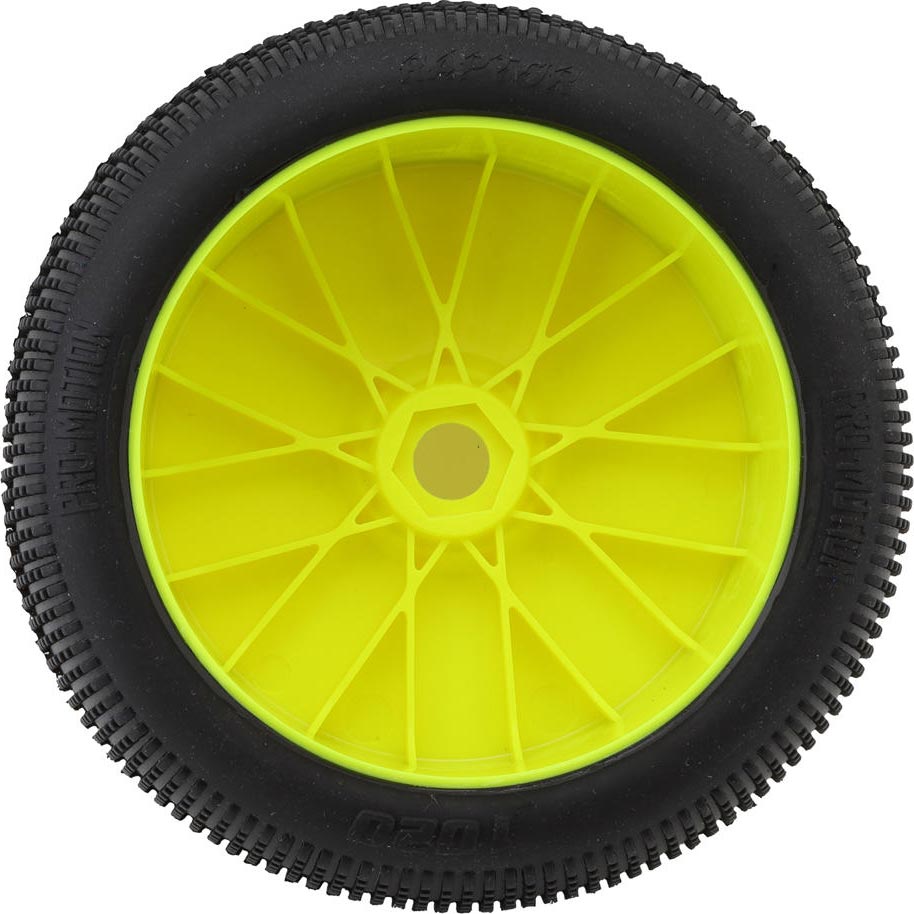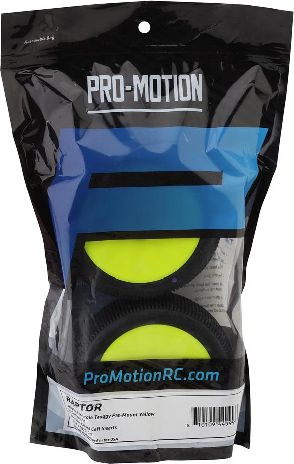 The Pro-Motion Raptor 1/8 Truggy Pre-Mount Tires bring the high performance you expect from Pro-Motion. Using small to medium size square pins these tires are an excellent all around tire option. The evenly spaced pins provide great forward bite and consistent traction. Incorporating alternating bridged pins in the middle of the tire helps to keep the pins from rolling over in high speed corners and removes the inconsistency that can be felt in similar tire designs. These Raptor tires provide consistent traction you can count on helping you to reach the podium!