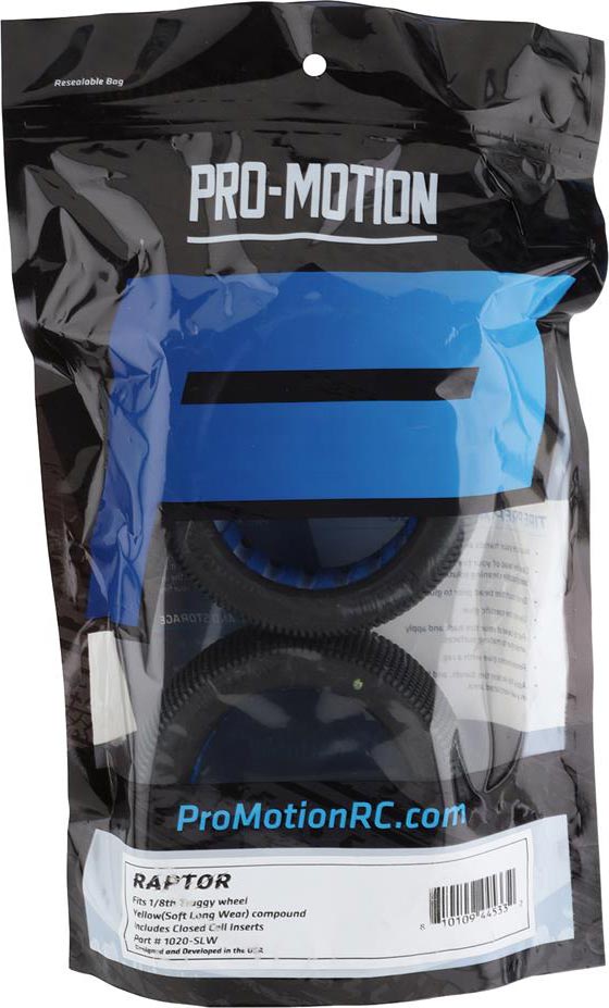 The Pro-Motion Raptor 1/8 Truggy Tires bring the high performance you expect from Pro-Motion. Using small to medium size square pins these tires are an excellent all around tire option. The evenly spaced pins provide great forward bite and consistent traction. Incorporating alternating bridged pins in the middle of the tire helps to keep the pins from rolling over in high speed corners and removes the inconsistency that can be felt in similar tire designs. These Raptor tires provide consistent traction you can count on helping you to reach the podium!