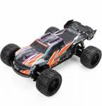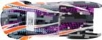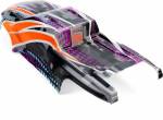 The design goes full throttle. A loud Digital camo layout tears across the body, layered with deep blacks, steel greys, and metallic silver that create depth and motion through every panel. Bright orange side sections punch through the darker tones, while electric purple and cyan accents scatter across the graphics like sparks flying off the pavement. The result is a high-energy race livery that looks fast before the wheels even spin.