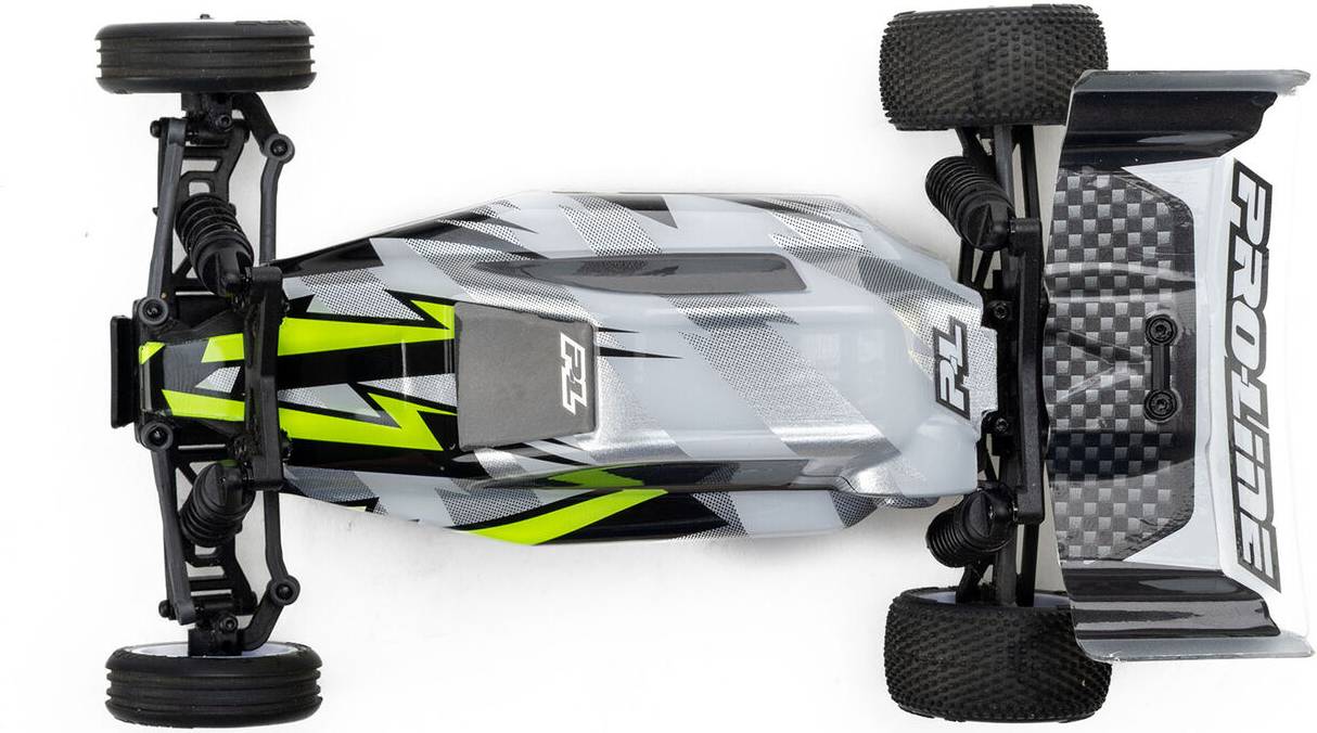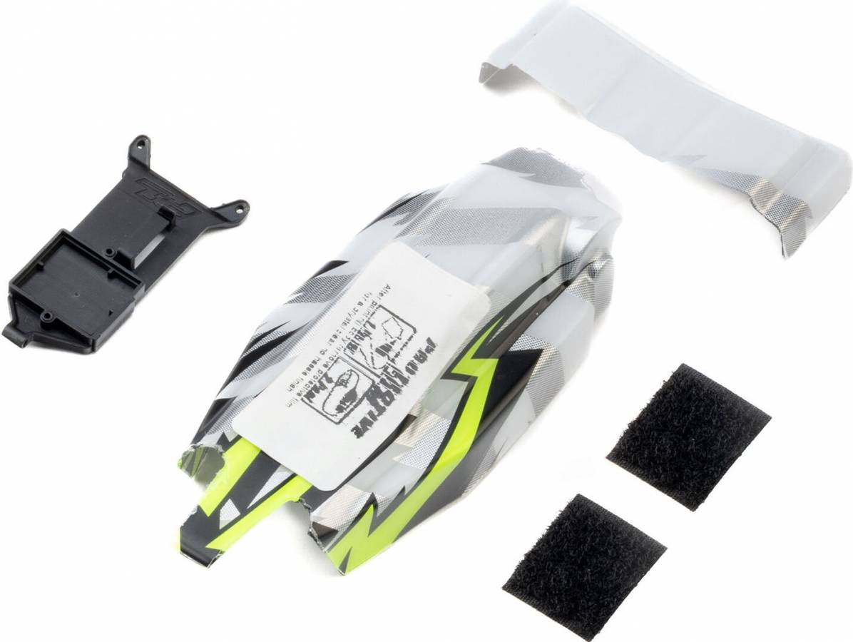 Visually, the bold neon yellow base and striking lightning graphics bring an unmistakable energy to the platform, creating a high-contrast, race-inspired look that demands attention on the track. The layered design adds depth and motion, making the Micro-B appear fast even at a standstill while improving visibility during racing. The body arrives pre-cut and pre-painted, so there's no trimming or masking required. Trim the wing, mount it, apply the included decals, and you're ready to run.