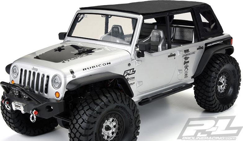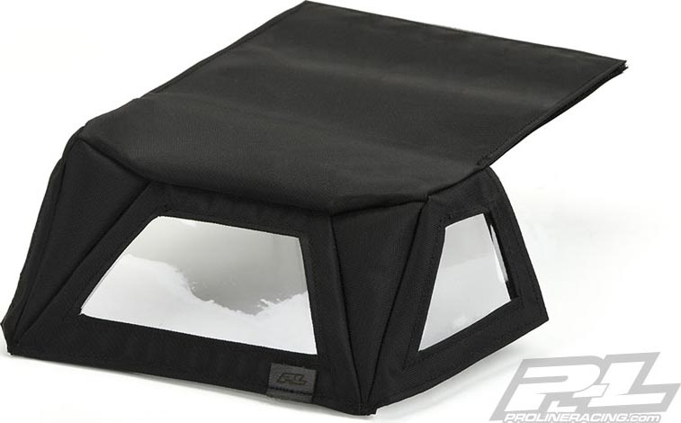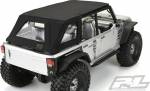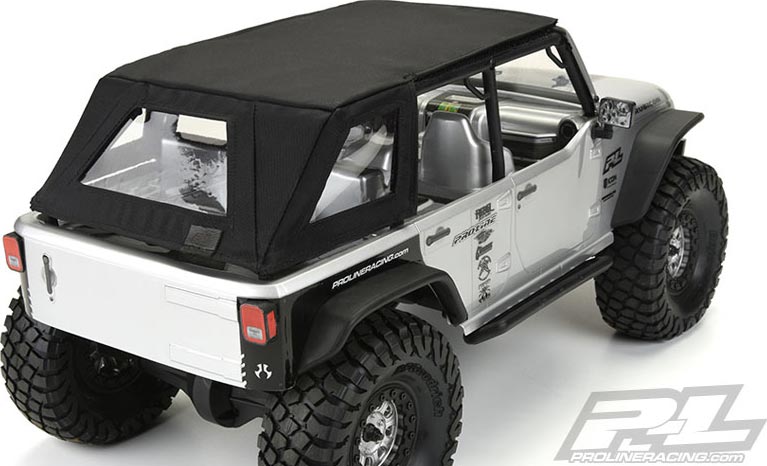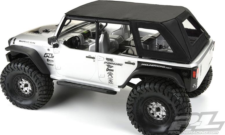 This is a Soft-Top Scale Accessory for the SCX10 Jeep® Wrangler Unlimited Rubicon. Pro-Line has a hot new scale accessory that will make your rig stand out from the rest: the TimberLine Soft-Top for the SCX10 Jeep Wrangler Unlimited Rubicon! Made from Black Nylon with Clear Vinyl Windows, the TimberLine Soft-Top will fit perfectly on the stock Wrangler Cage with the included Velcro® mounts. We recommend attaching the included Velcro® strips to the Cage using Hot Glue or Pro-Line Tire Glue. Just like a full-size soft-top, Pro-Line’s TimberLine Soft-Top captures the details with a rear window, two side windows and a full length soft roof to protect your important cargo! A small, sewn in P-L tag adorns the back so you know you are getting real Pro-Line quality. For the highest quality and most unique scale items, look no further than Pro-Line! Get your own TimberLine Soft-Top today!