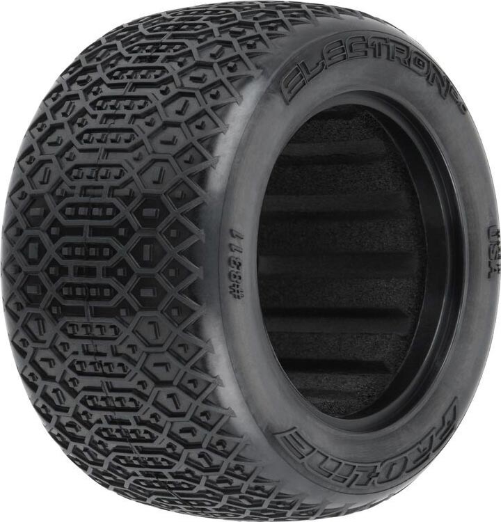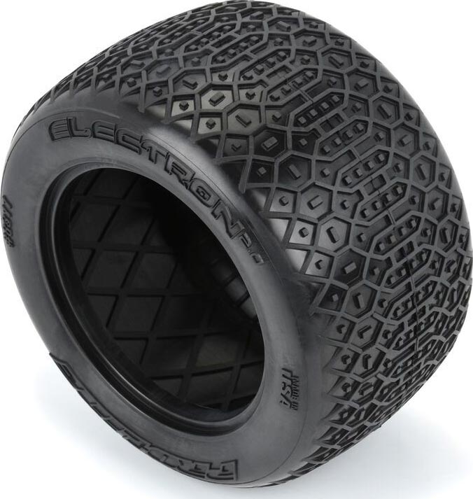 The Electron 2.0 T is constructed on Pro-Line's latest generation carcass profile that utilizes a single arc to create the sidewall geometry, then transitions from the sidewall to the crown with a larger radius resulting in a rounder and less edgy appearance. This carcass provides a tailored fit to the wheel and insert package, making mounting a breeze. Racers can expect the Electron 2.0 tires to deliver improved consistency, drivability, and durability.