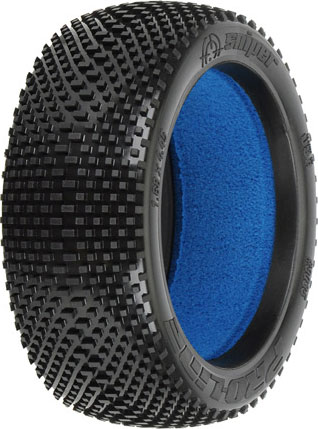 This is a pair of Pro-Line Sniper 1:8 buggy tires. Honey, I blew up the Hole Shot! The Sniper uses the same design philosophy and technology as the Hole Shot, but scaled up to work in looser and dustier conditions. After initial testing, Pro-Line team drivers like Ryan Cavalieri are already sold on the tire saying that the Sniper offers awesome forward traction and side bite in a variety of track conditions. The bigger pins also provide longer wear, giving you lasting traction through long A-mains.