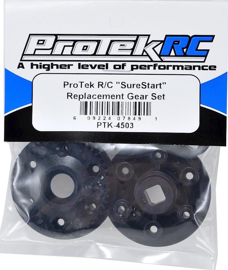 This is a replacement ProTek R/C "SureStart" Gear Set, and is intended for use with the ProTek R/C "SureStart" 1/8 off road starter box (PTK4500). Package includes two large gears that attach to the starter wheel, and two small pinion gears.