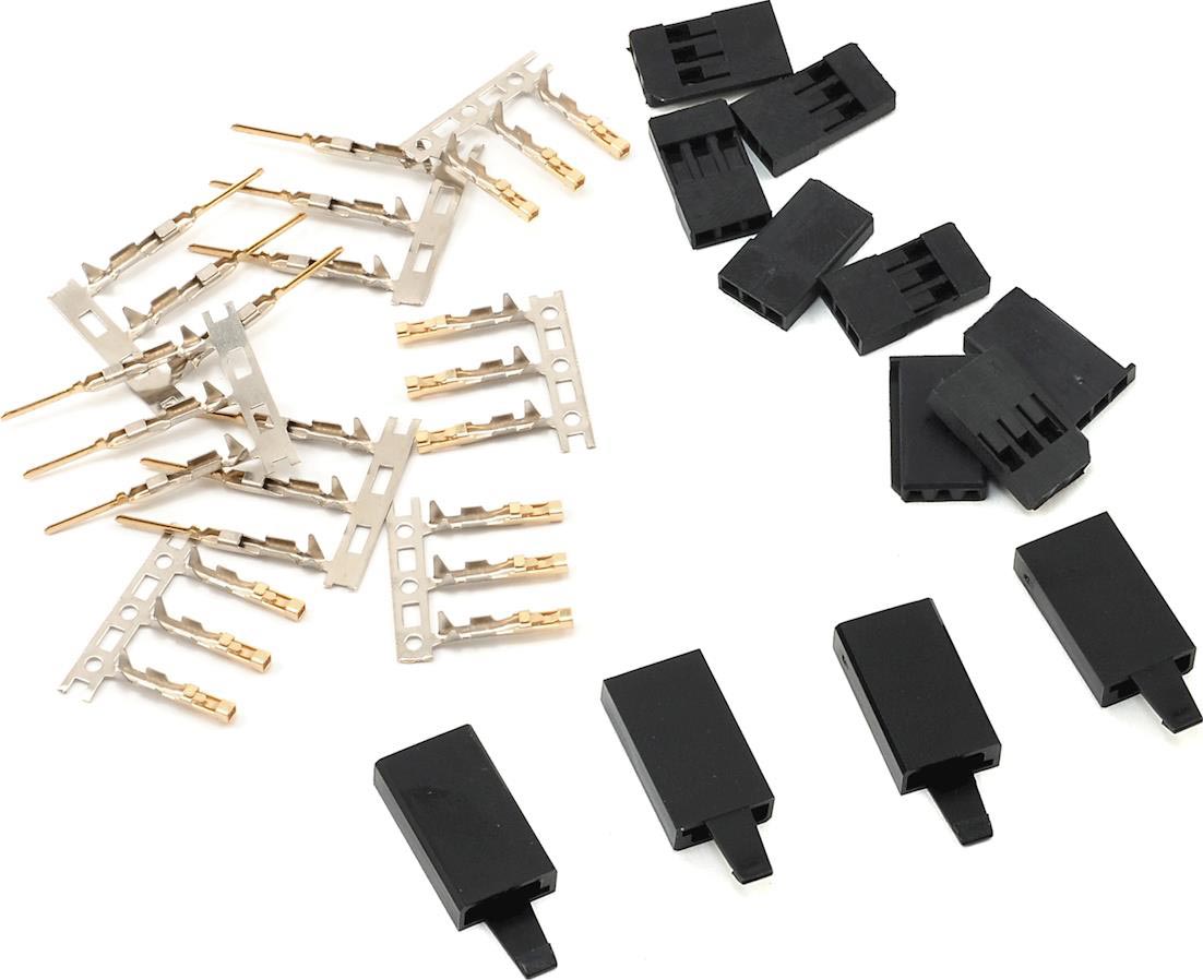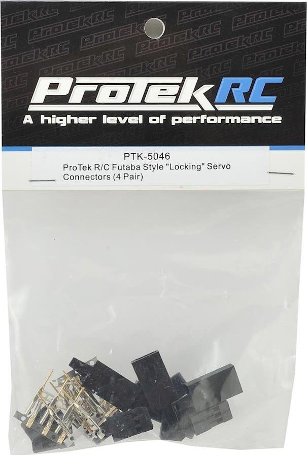 This is a pack of four pairs of locking Futaba style servo connectors. Included are four female and eight male connector housings (four Futaba and four JR style) and eight sets of connector pins. These are unassembled, and can be used to repair a bad servo lead, or to construct your own servo or battery connectors.