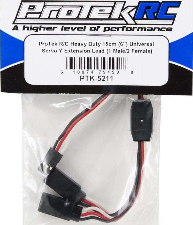 15cm (6") universal servo Y extension lead from ProTek R/C. These are excellent servo extension leads made with thick, high quality 22awg wire for maximum current carrying capacity and strength. The male plug installed on these extension leads are JR style connectors and will work with any radio system. The two female ends are designed to accept Futaba connectors, as well as JR, Aitronics and HiTec connectors. When plugging JR style connectors into the female connector, be sure to check for the correct polarity.