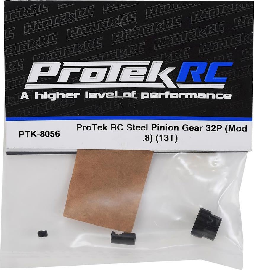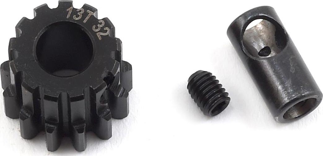 ProTek R/C Steel 32 Pitch Pinion Gears are an affordable pinion gear option that doesn't skimp on quality. CNC machined from hardened steel material, these precision cut gears are durable and are perfect for any 32 pitch application. Available in 11 - 20 tooth variants, these gears feature a 5mm bore with an included reducer sleeve that will allow use with standard 3.17mm size motor shafts. The tooth count and tooth pitch is engraved on the gear for easy identification, and each gear includes a setscrew to make installation easy. Choose the tooth count you need from the pull down menu above.