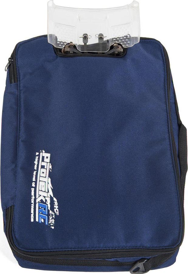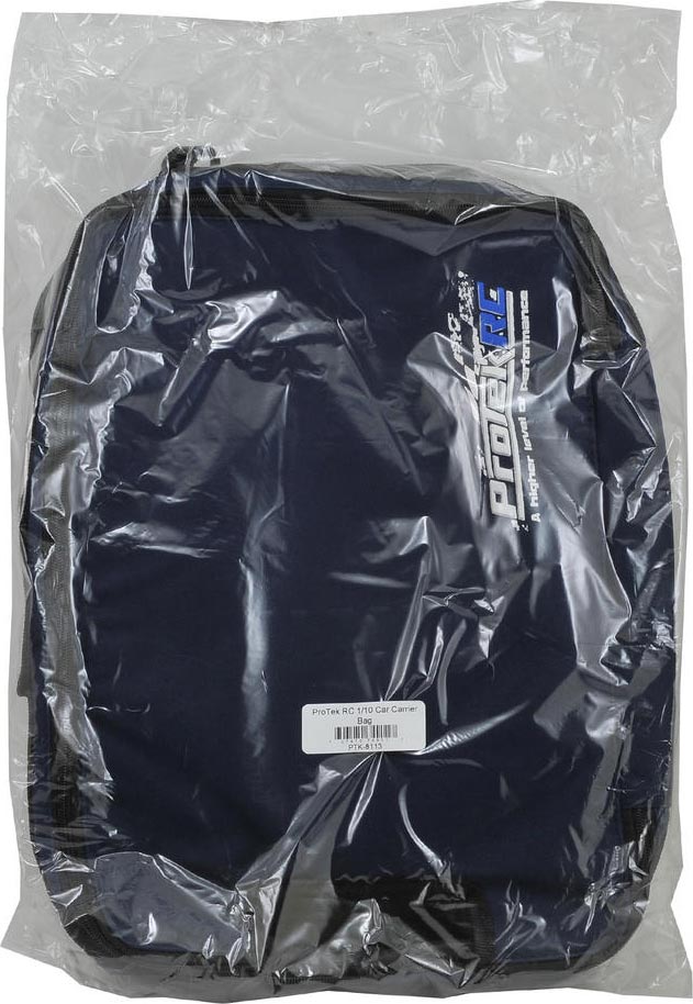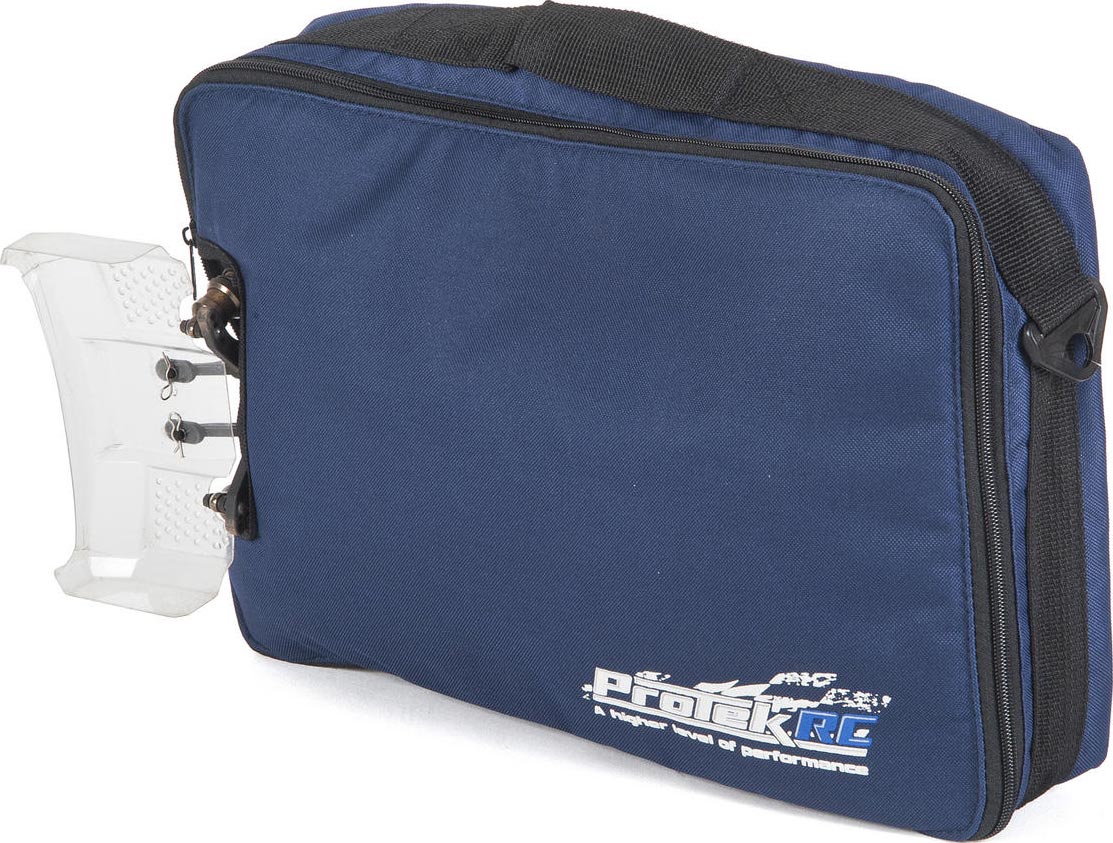 The ProTek R/C Carrying Bag is big enough to fit one 1/10 buggy with body and tires attached. Two durable zippers close the lid, meeting at the wing stay, leaving the wing exposed. For easy carrying, grab the wing, the side handle on the bag, or attach your own shoulder strap to the two plastic latches. The bag is also carry-on sized so it works great for plane flights.