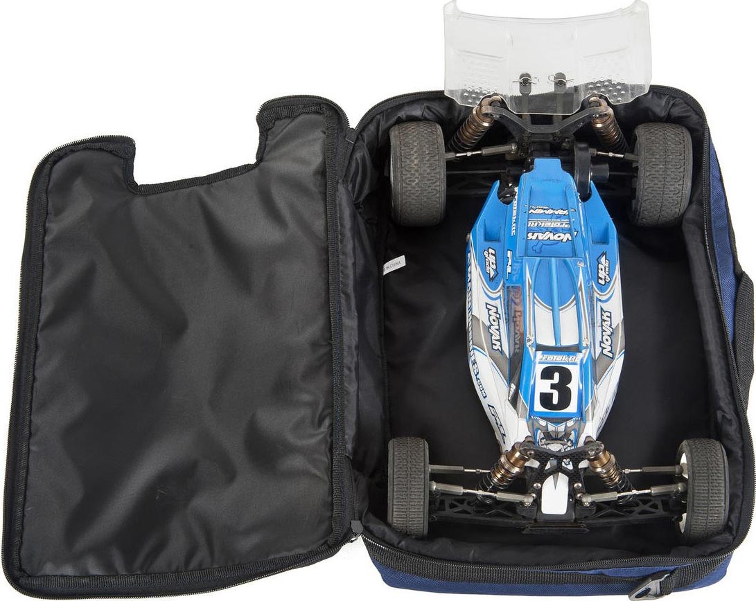 Designed for racers looking for a convenient solution to transport an electric 1/10 buggy, the bag is a great way to keep your buggy from rolling around in your car or back of your truck, containing all the dirt and grime after a long day at the track. It also fits great on top of your hauler bag when loading or unloading at the track.