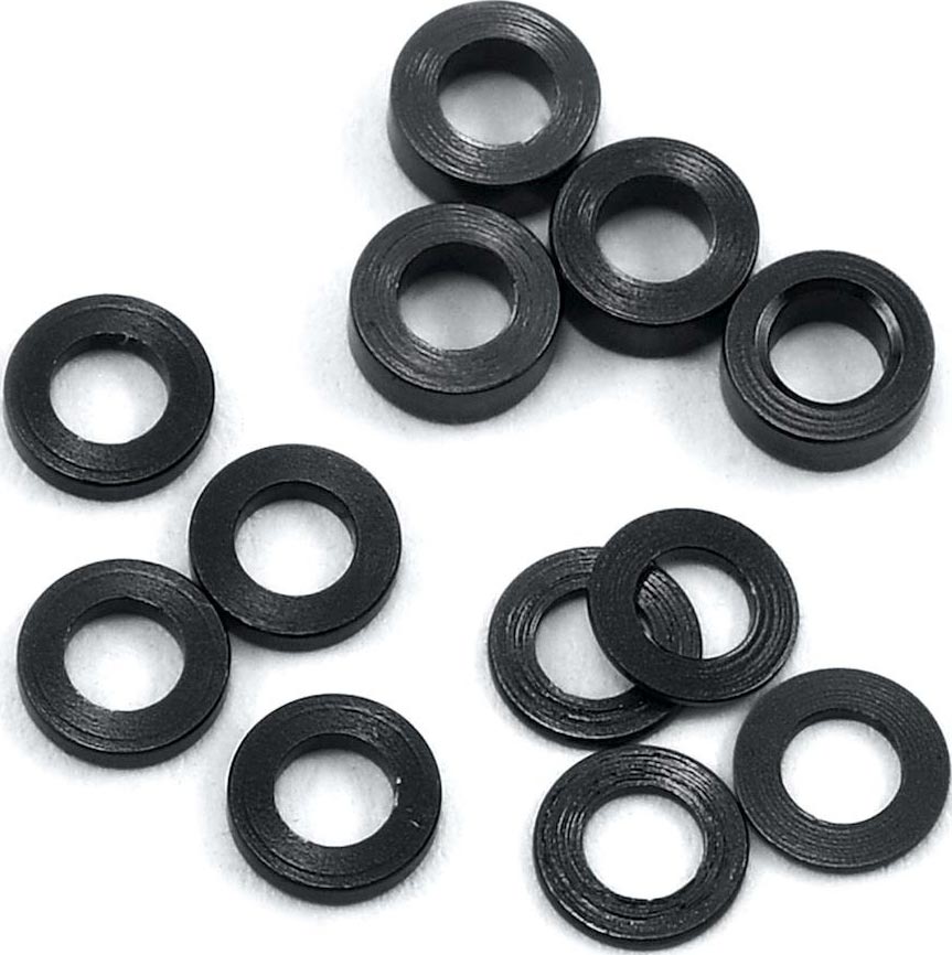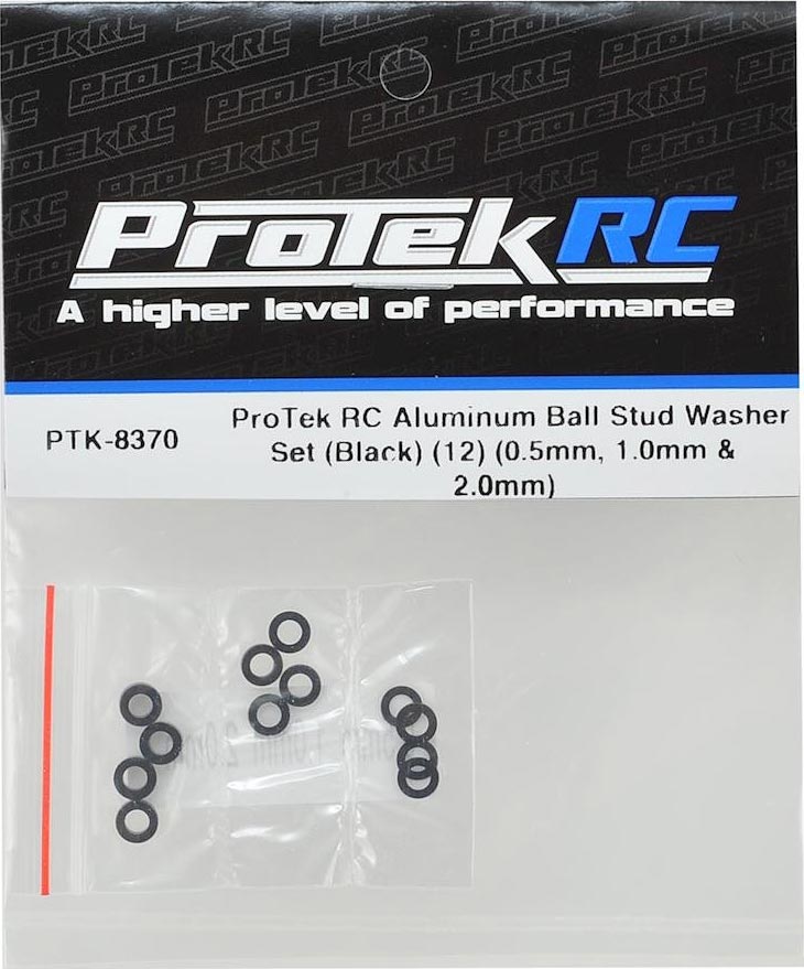 This ProTek R/C Aluminum Ball Stud Washer Set includes 3x5.5mm Black anodized aluminum washers in the following thicknesses: 0.5mm, 1.0mm and 2.0mm. There are four washers included for each thickness, equaling twelve washers total.