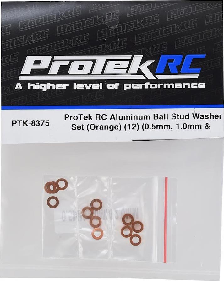 This ProTek R/C Aluminum Ball Stud Washer Set includes 3x5.5mm Orange anodized aluminum washers in the following thicknesses: 0.5mm, 1.0mm and 2.0mm. There are four washers included for each thickness, equaling twelve washers total.