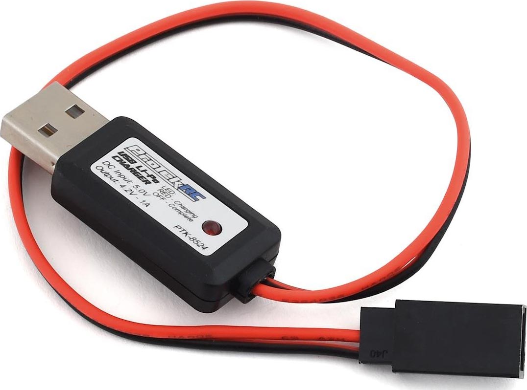 The ProTek RC 1S USB LiPo Charger was developed specifically for ProTek RC PTK5197 and PTK5550 1S LiPo transmitter batteries. Have you found that your charger is not fully peaking your transmitter packs? Some high end chargers struggle to put a full charge on these batteries due to the way the charger measures resistance, and no matter what you do, they will not peak at full capacity. This small and affordable option solves that problem. With a fixed 1 amp charge rate, LED charge indicator, and easy USB power access, this easy to use charger will ensure your JR connector equipped 1S transmitter batteries get a full charge each and every time.