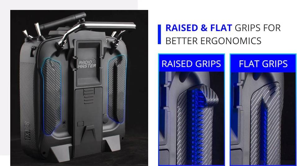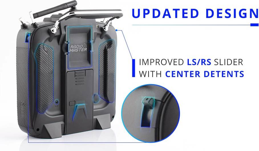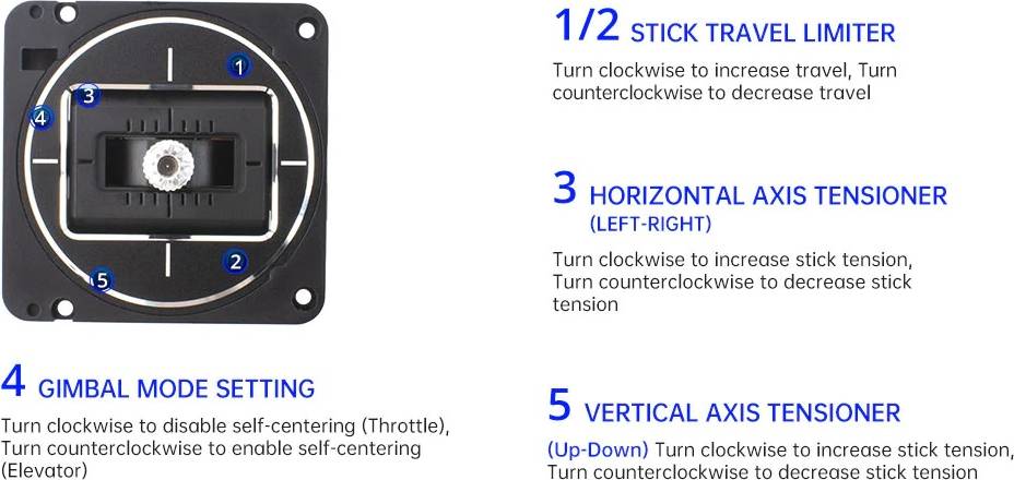 Comes standard with V4.0 Hall Gimbals, which has the same chipset as the AG01 gimbals, optimized hall sensor circuitry, improves center point positioning and temperature stability. Stick travel, self-centering and stick tension are now externally adjustable.